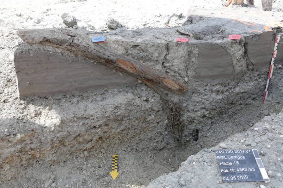 Bern Kantonu Arkeoloji Servisi, Stefan AebersoldBiel'deki Neolitik köyün kuzey kenarında bulunan bir yapı direği.
