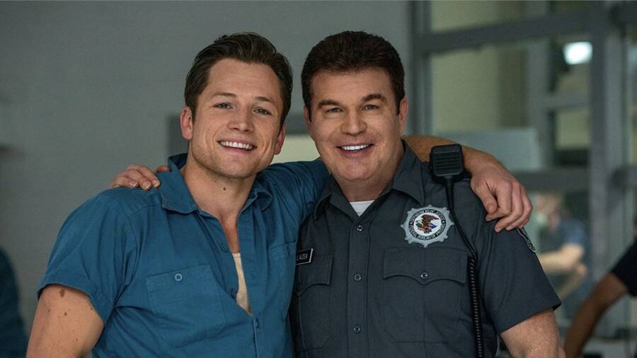Apple/XSchauspieler Taron Egerton, der Jimmy Keene in Schwarzer Vogel spielt (links), mit dem echten Jimmy Keene (rechts) am Set.