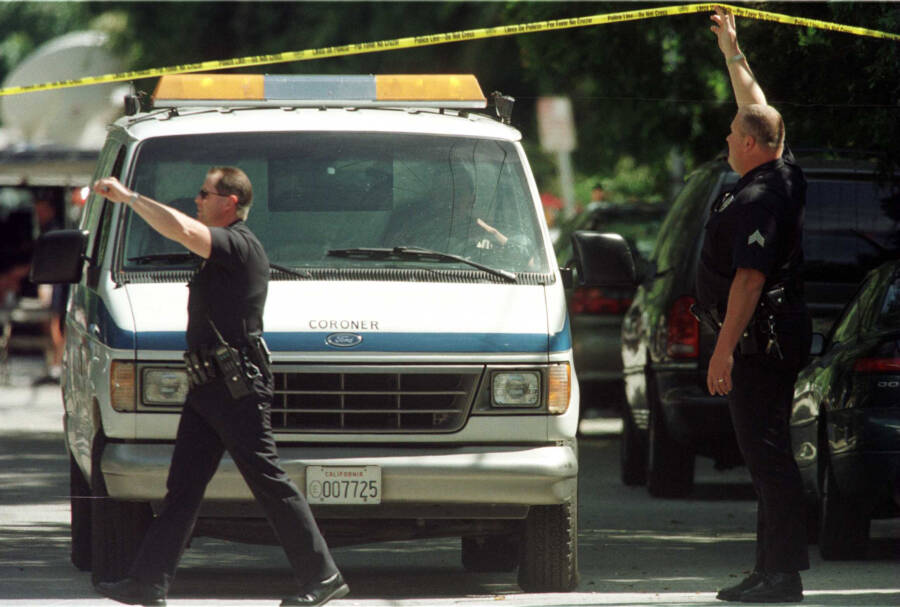John Chapple/OnlineUSA/Getty ImagesBir adli tıp aracı, Phil Hartman ve eşinin cesetlerini evlerinden taşıyor. Encino, California. 28 Mayıs 1998.