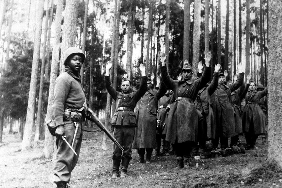 Flickr/ArmyDiversityAn American soldier guarding German soldiers captured in a forest. April 1945.