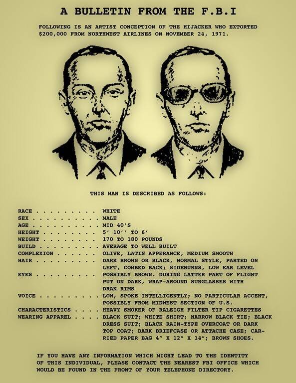 Ve sonra, Pasifik Kuzeybatısı ormanlarının üzerinde bir yerde, Cooper kayboldu. Bir paraşüt ve parayı alarak ortadan kayboldu.